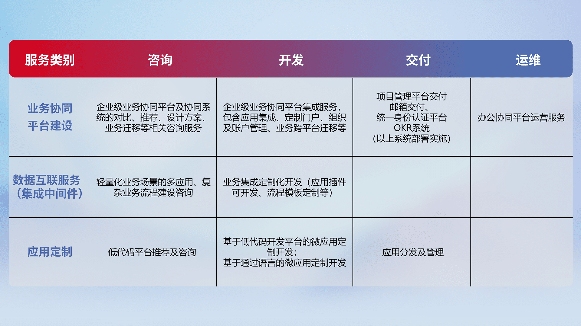 针对钉钉、、企微、、、、IDaas等平台级产品提供产品的规划、、、方案、、交付、、定制化开发等服务,,,实现如统一协同办公、、、、智能客户服务、、、混合会议管理、、智能数据查询、、等业务场景,,,,实现数字化转型。。。。