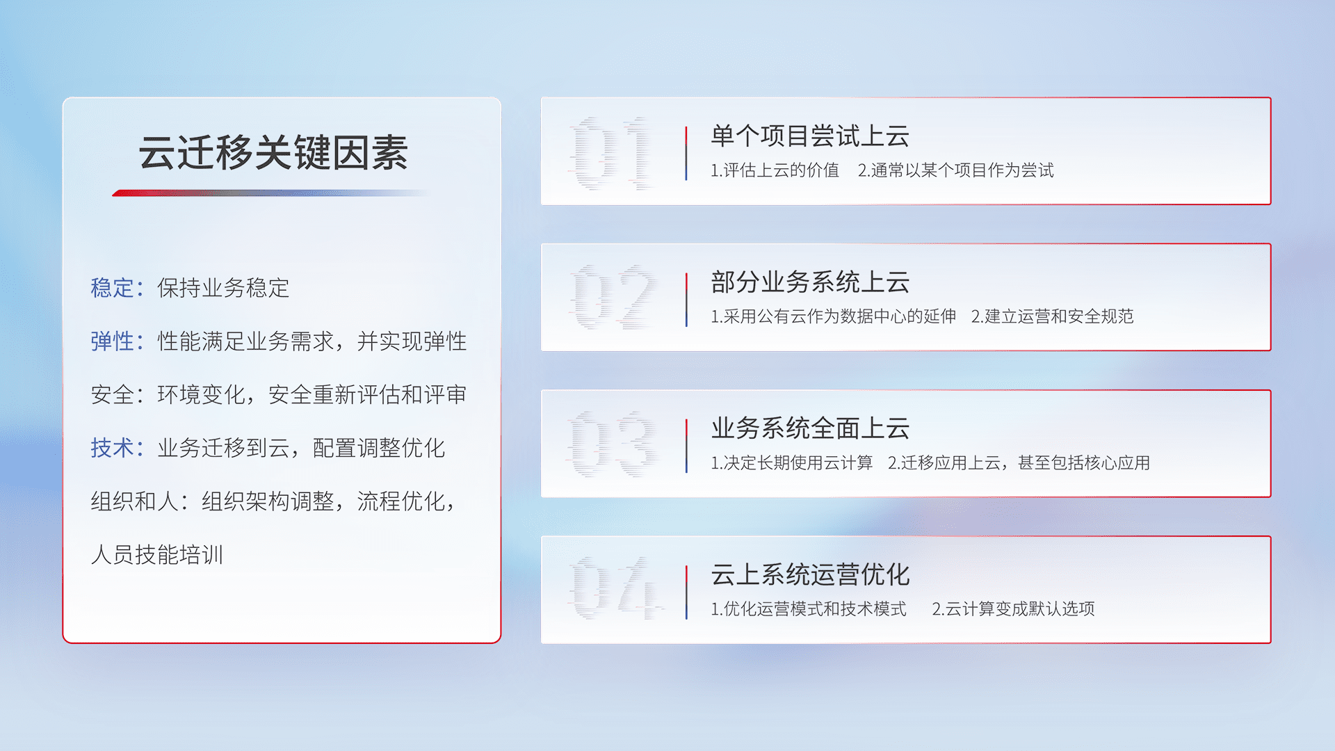结合实际业务,,,从规划设计、、、云平台选型、、云原生改造、、、数据迁移、、、、集成交付,,,,迁移全过程为客户识别最佳上云路径,,做好风险识别管理,,设计网络架构、、、身份权限、、安全审计合规、、、、操作审计、、、日志审计、、、、监控告警策略、、、多站点容灾设计等,,,,对云上基础设施进行整体规划,,提升IT治理水平,,,以满足弹性、、、高可用、、、、高性能的需求。。。