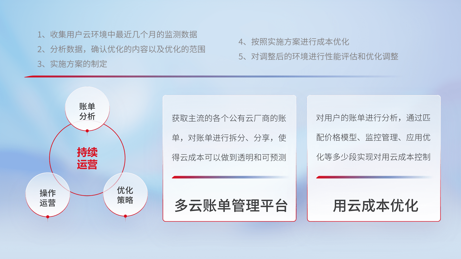 通过多云纳管,,,以统一的资源数据模型把客户的云资源进行抽象和封装,,进而实现对多云资源的统一操作,,,,保障云资源管理的可靠性、、、、稳定性与可用性。。。。量身定制化运维内容,,配置、、、开发运维、、、、补丁管理、、、、备份、、、、监控、、、认证和访问管理、、、、审计和日常巡检等,,保障在用云过程中的可靠度,,,稳定度以及高可用率。。。。